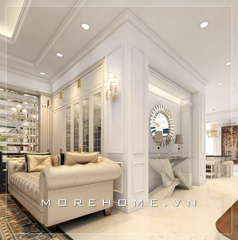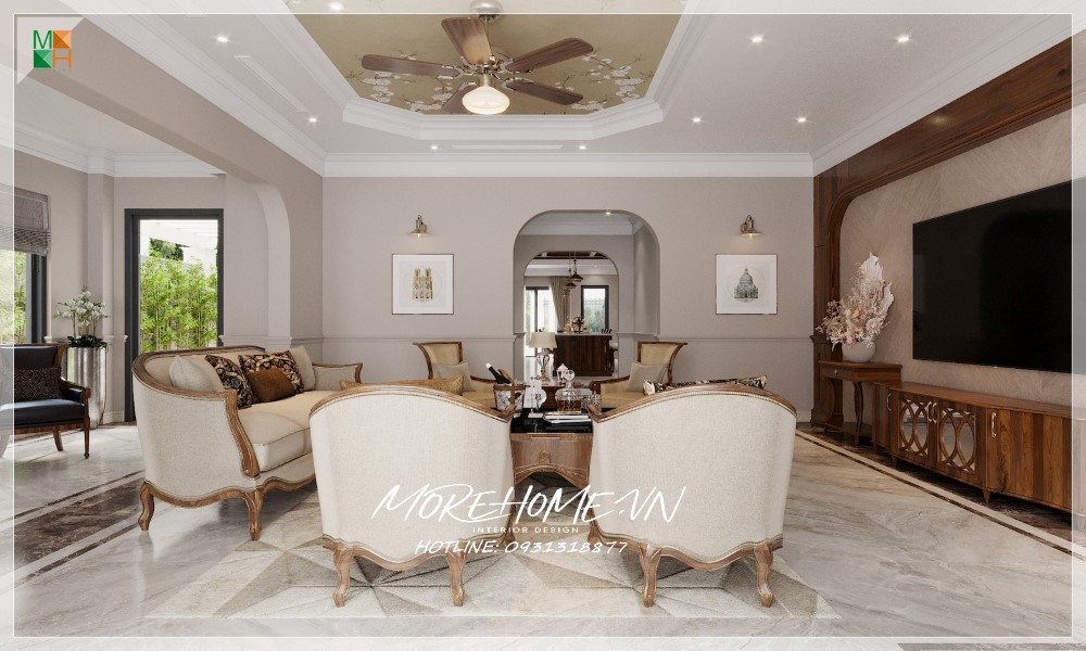 Vẻ đẹp thu hút mọi ánh nhìn cho phòng khách biệt thự nhà phố với tâm điểm là bộ sofa tân cổ điển bọc vải màu trắng, khung gỗ óc chó đẳng cấp, sang trọng tinh tế.
