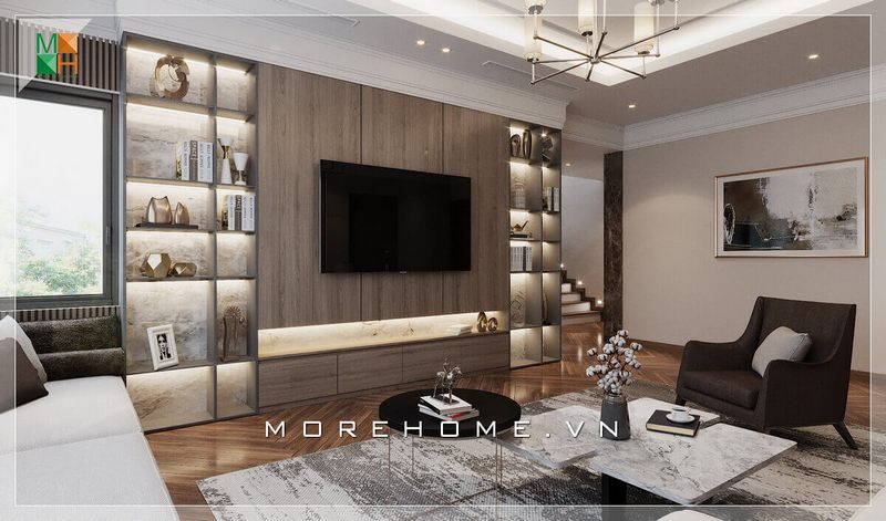 Không gian phòng khách sang trọng với kệ ti vi hiện đại